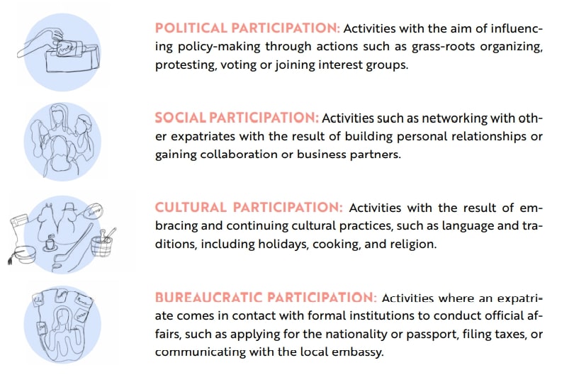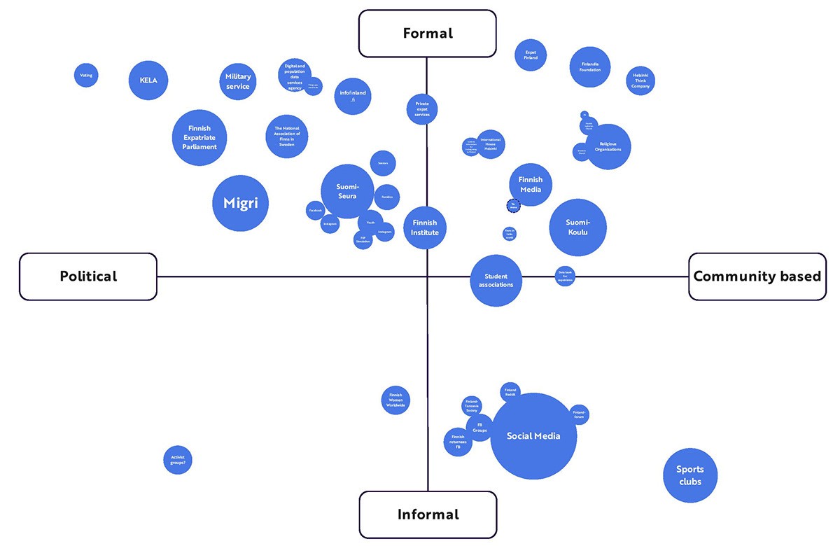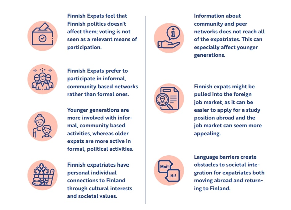 Expatriates tend to prefer informal, community-based networks over political channels or formal organizations since Finnish politics generally do not affect them while abroad. Although government services, such as mail-in voting and the Finnish Expatriate Parliament, promote formal participation, they often fail to engage certain underrepresented groups.
