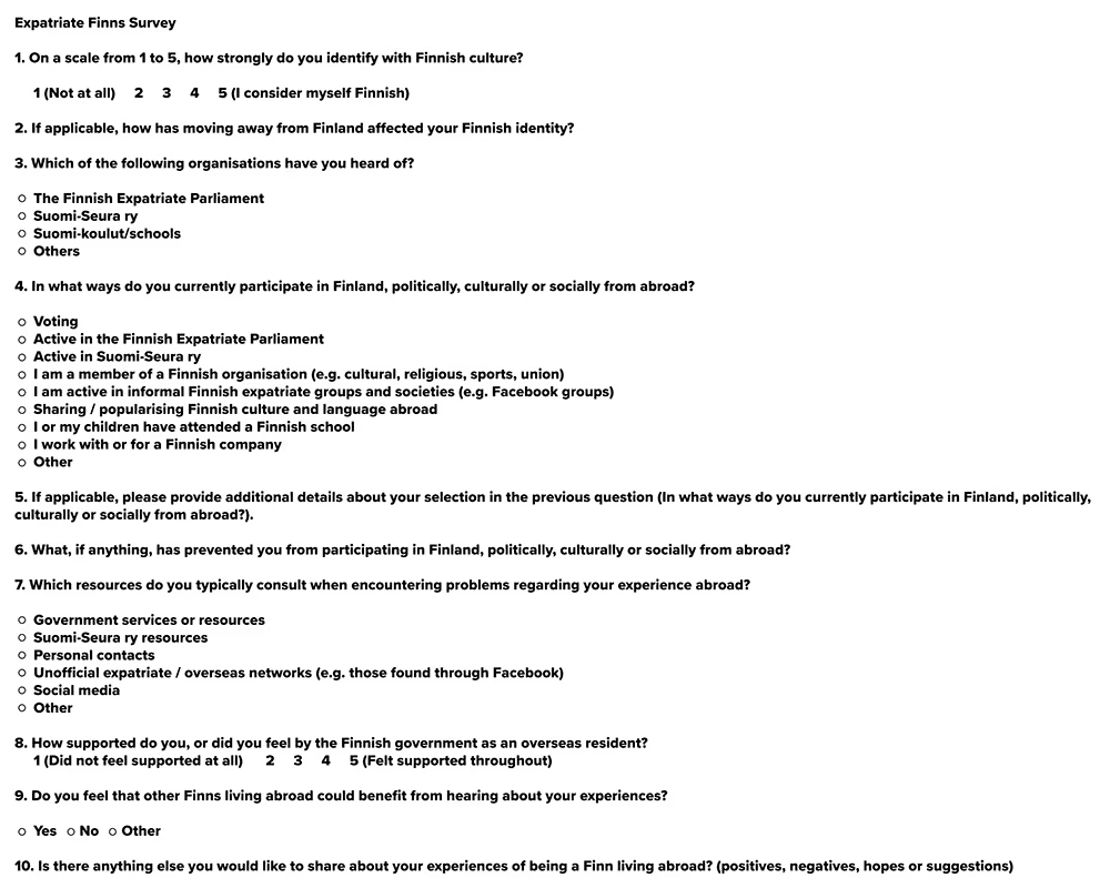 First, we create a survey studying Finnish who lived or are living abroad to understand their relationship with their home country. We posted a survey on expatriate social media groups and got 844 responses in total. The survey questions are listed below.