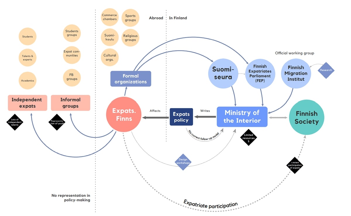 The figure below shows the context in which we approached our intervention. The Finnish Ministry of the Interior works with the Finnish Expatriates’ Parliament (FEP), Suomi-Seura who represent the voice of the expatriates, and with the Finnish Migration Institute contributing research.