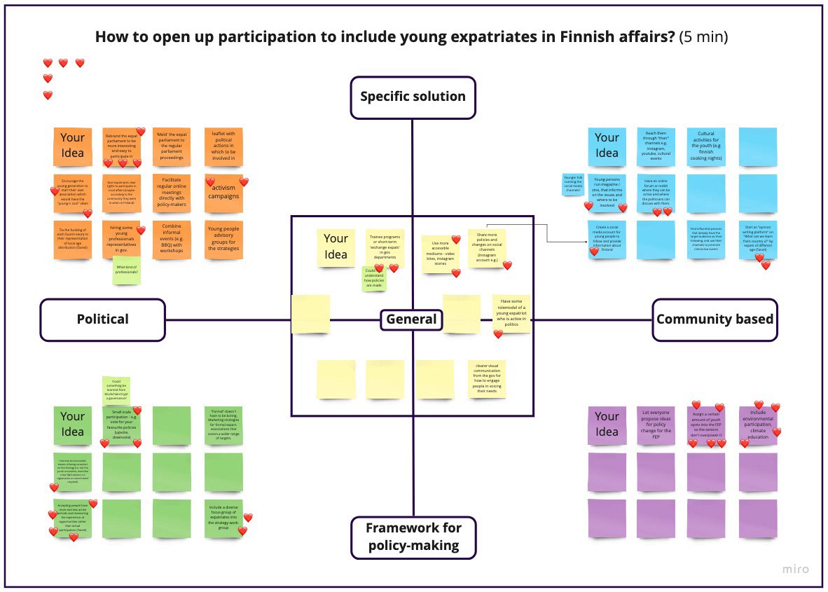 We held a collaborative ideation session with professors and students from the Design for Government course, in which we discussed potential interventions to achieve our goal of increasing young expatriates' engagement.
