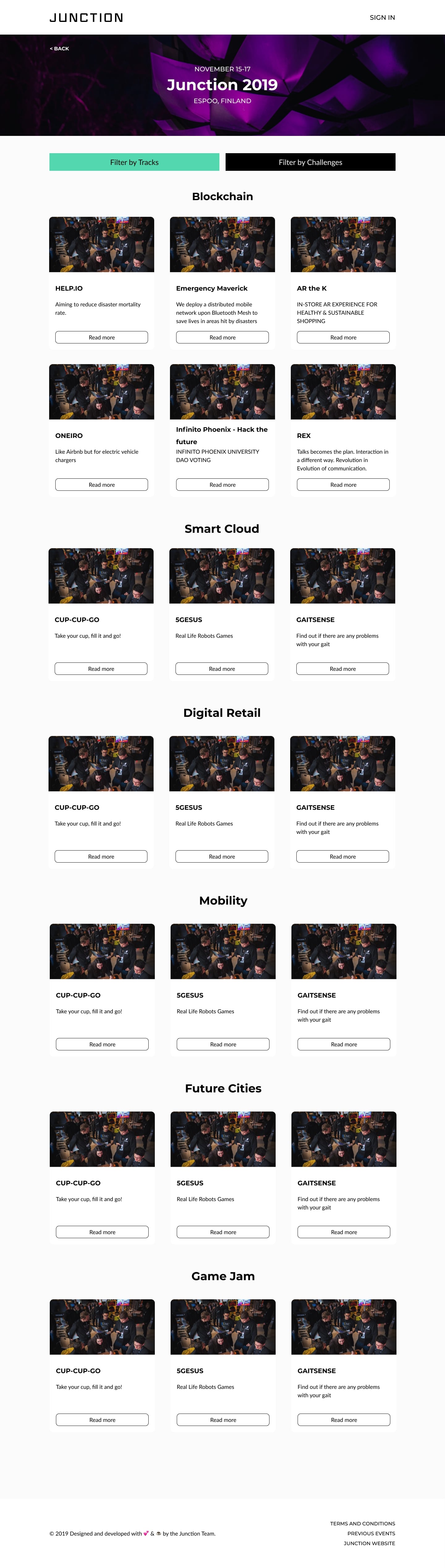 Needs | Timely information about the hackathon, support for their questions and logistic concerns. | Simple entry points for their challenges. | Feel part of the Junction community and gain experience |