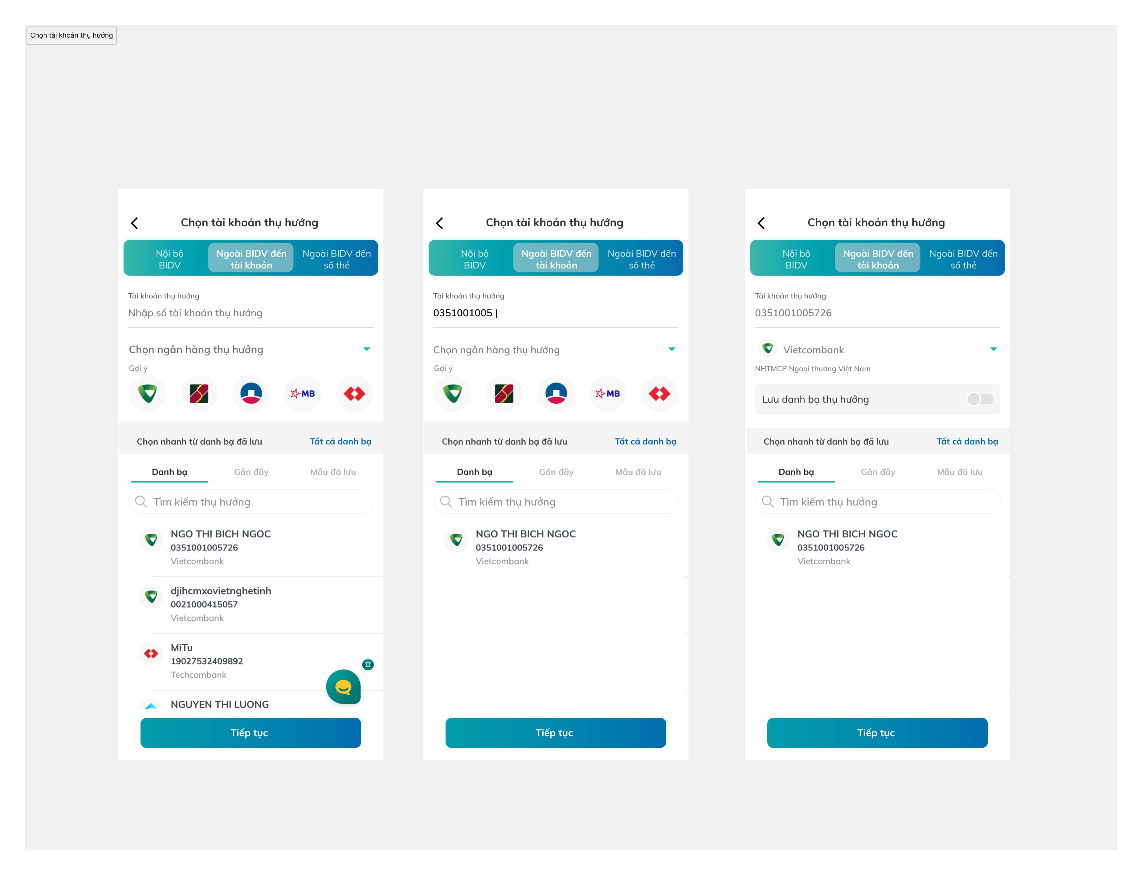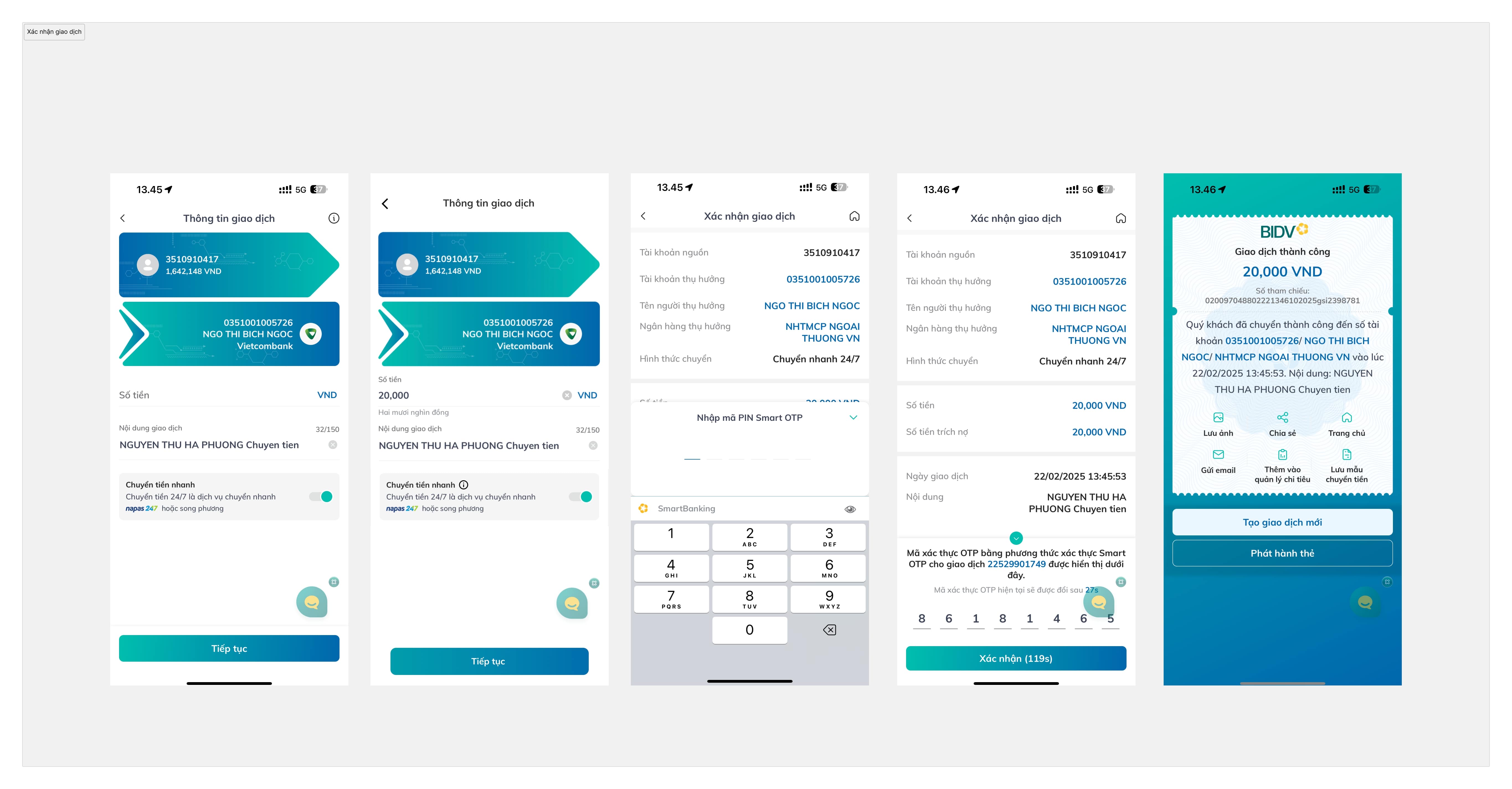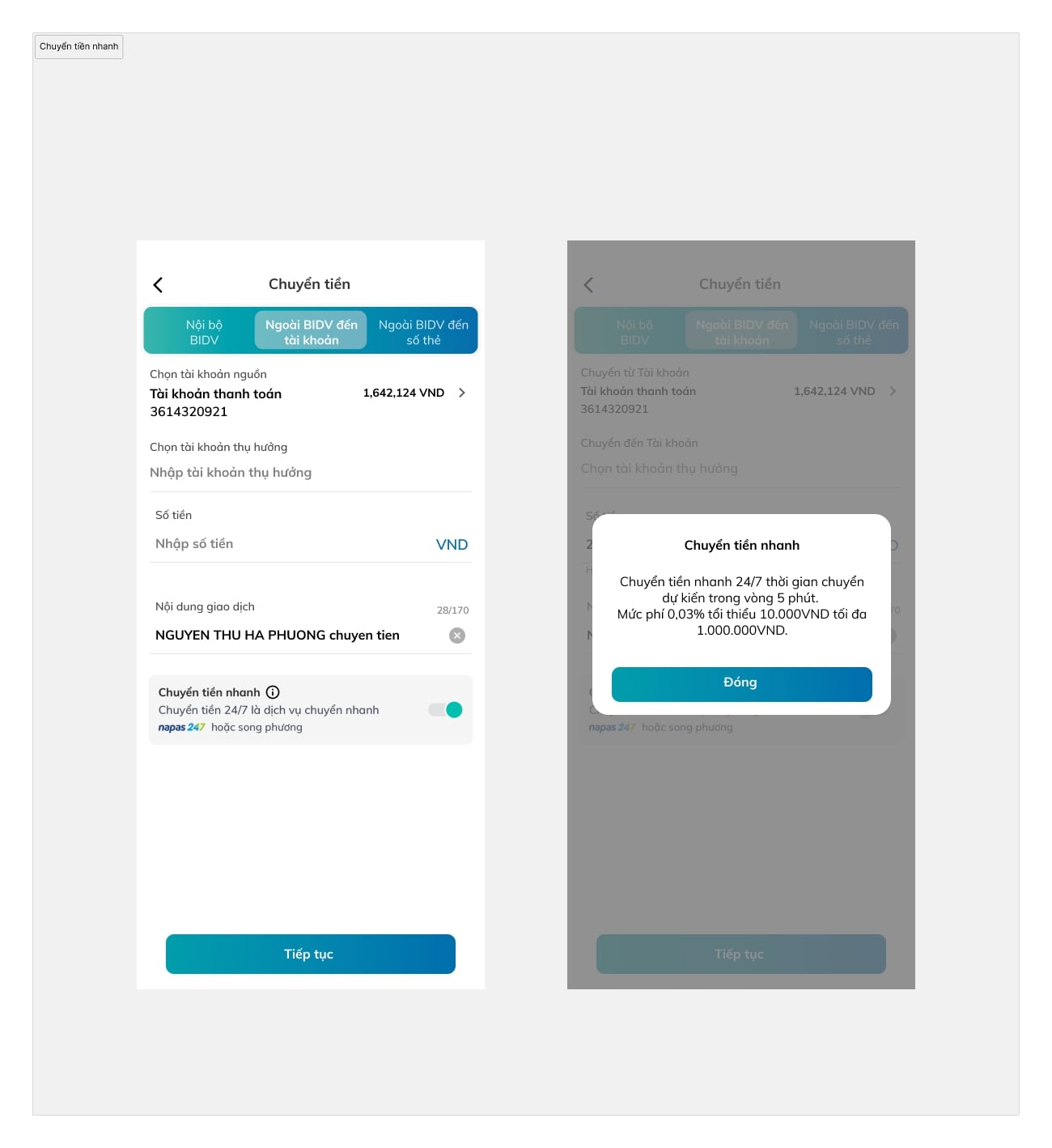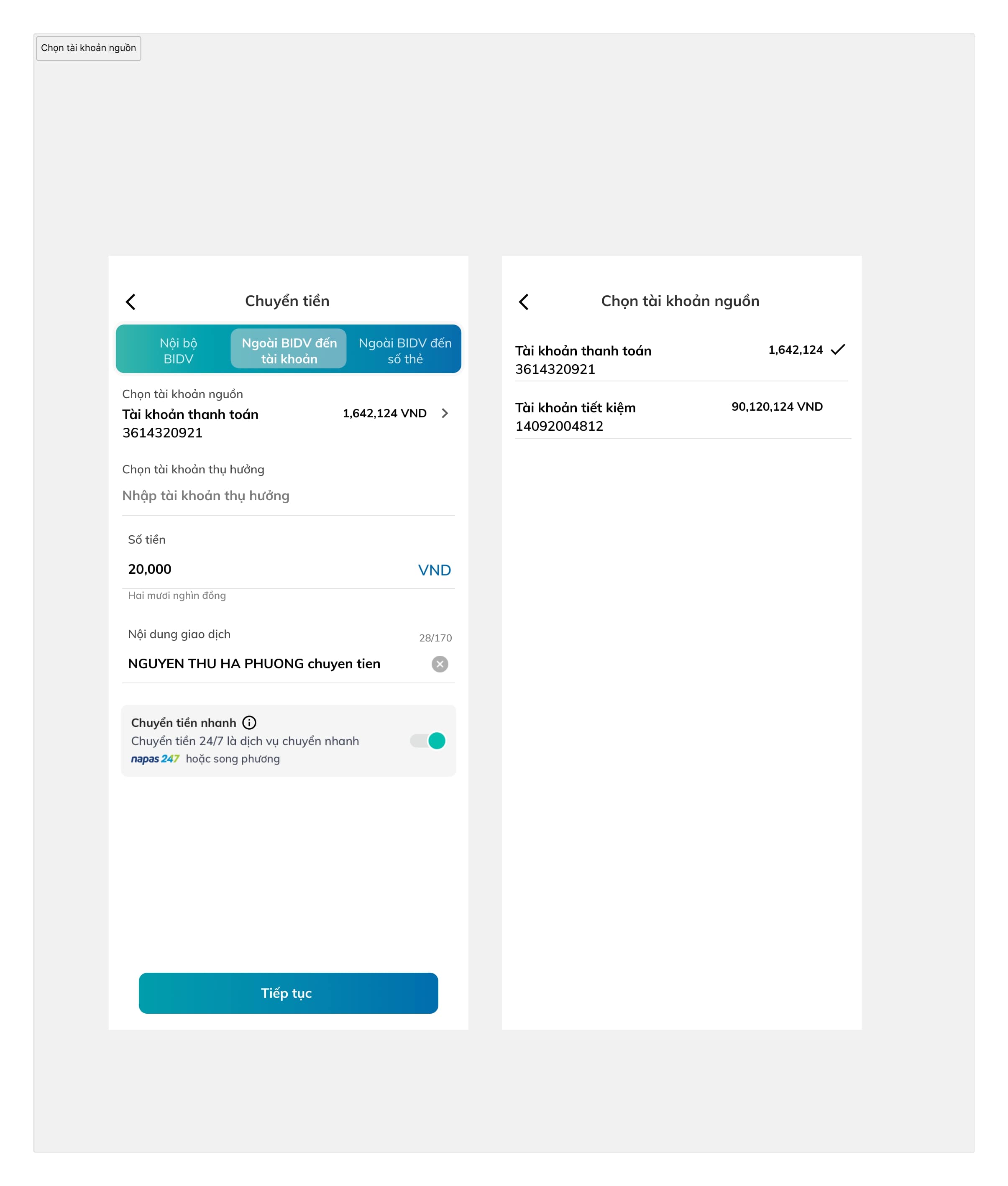 BIDV bank app: Cash transferring flow